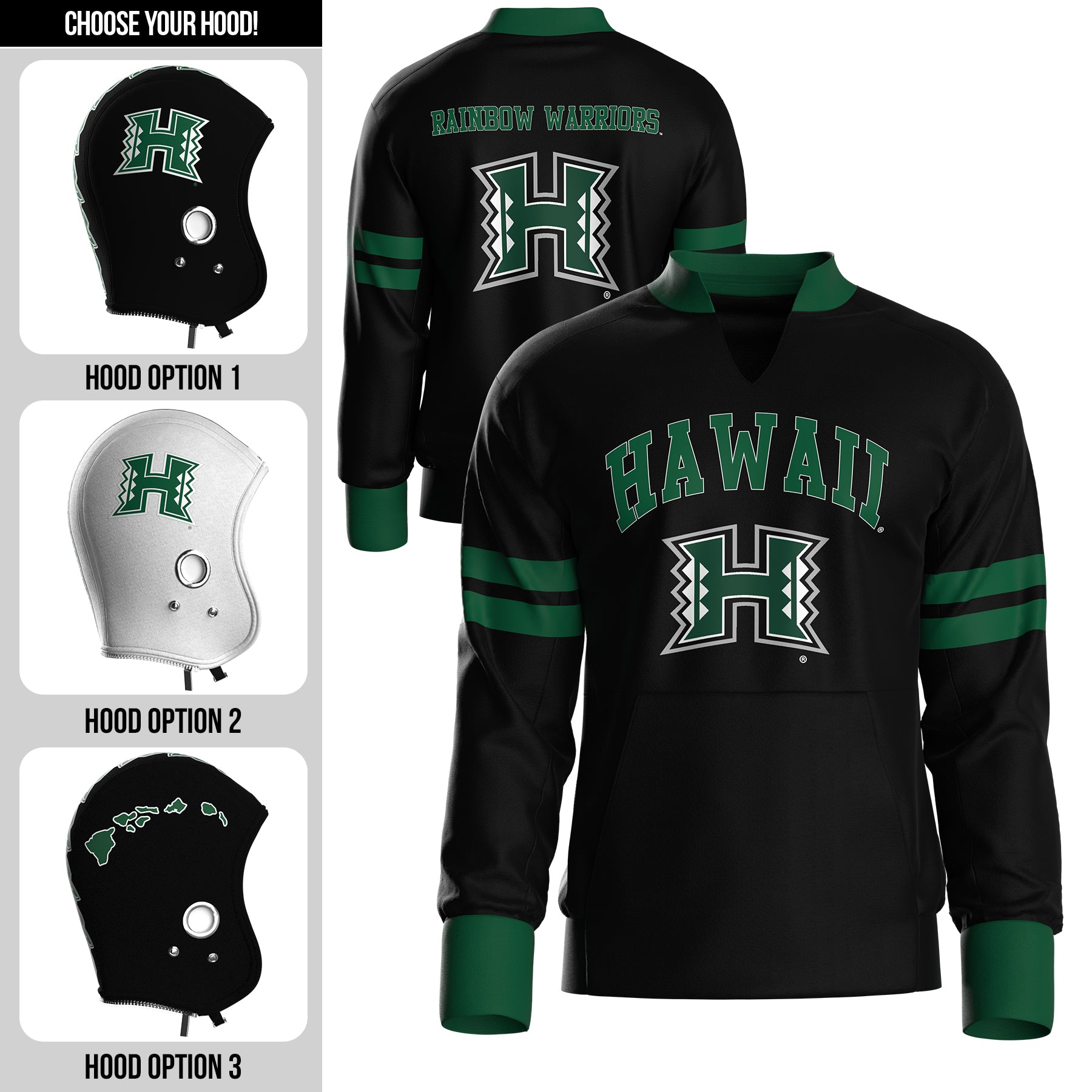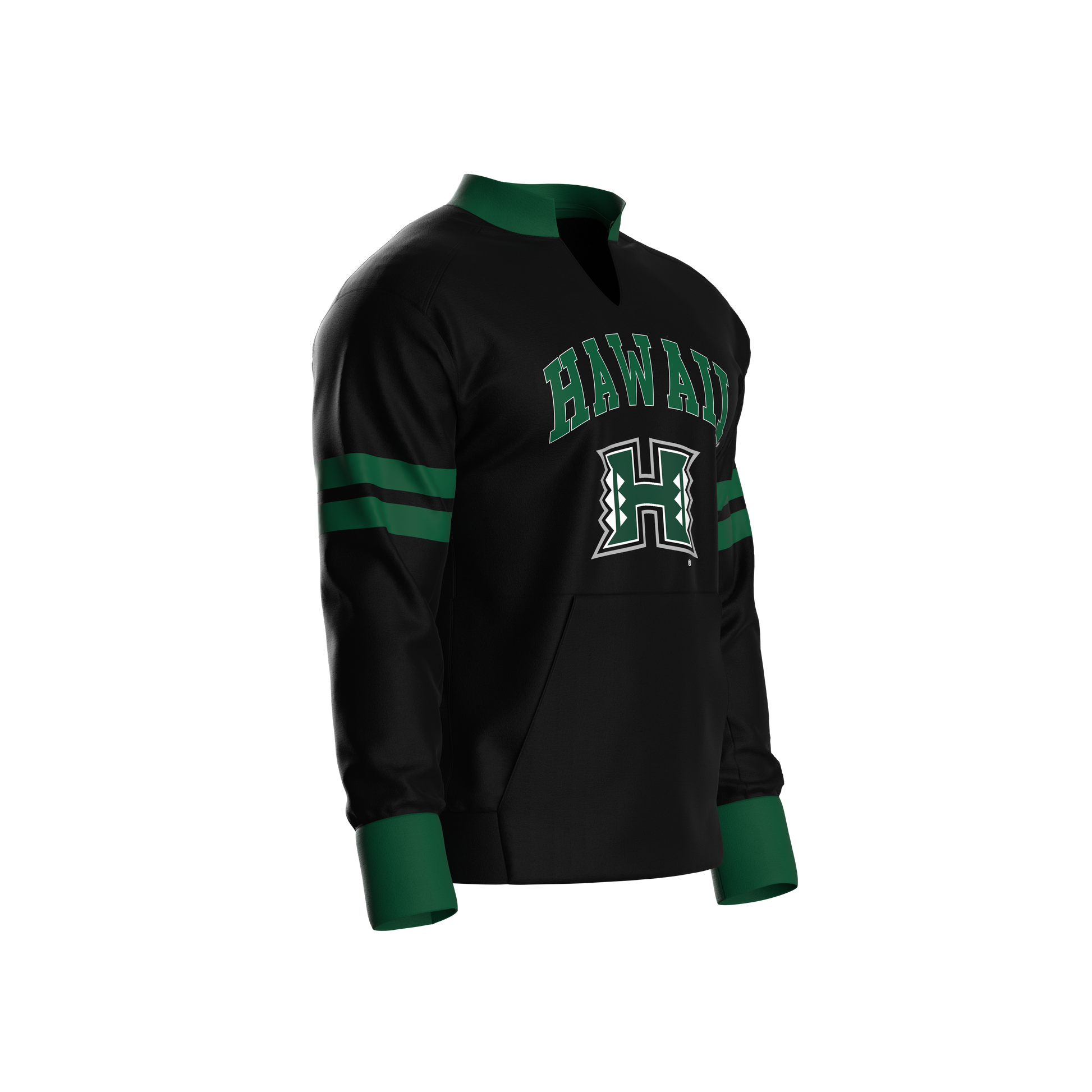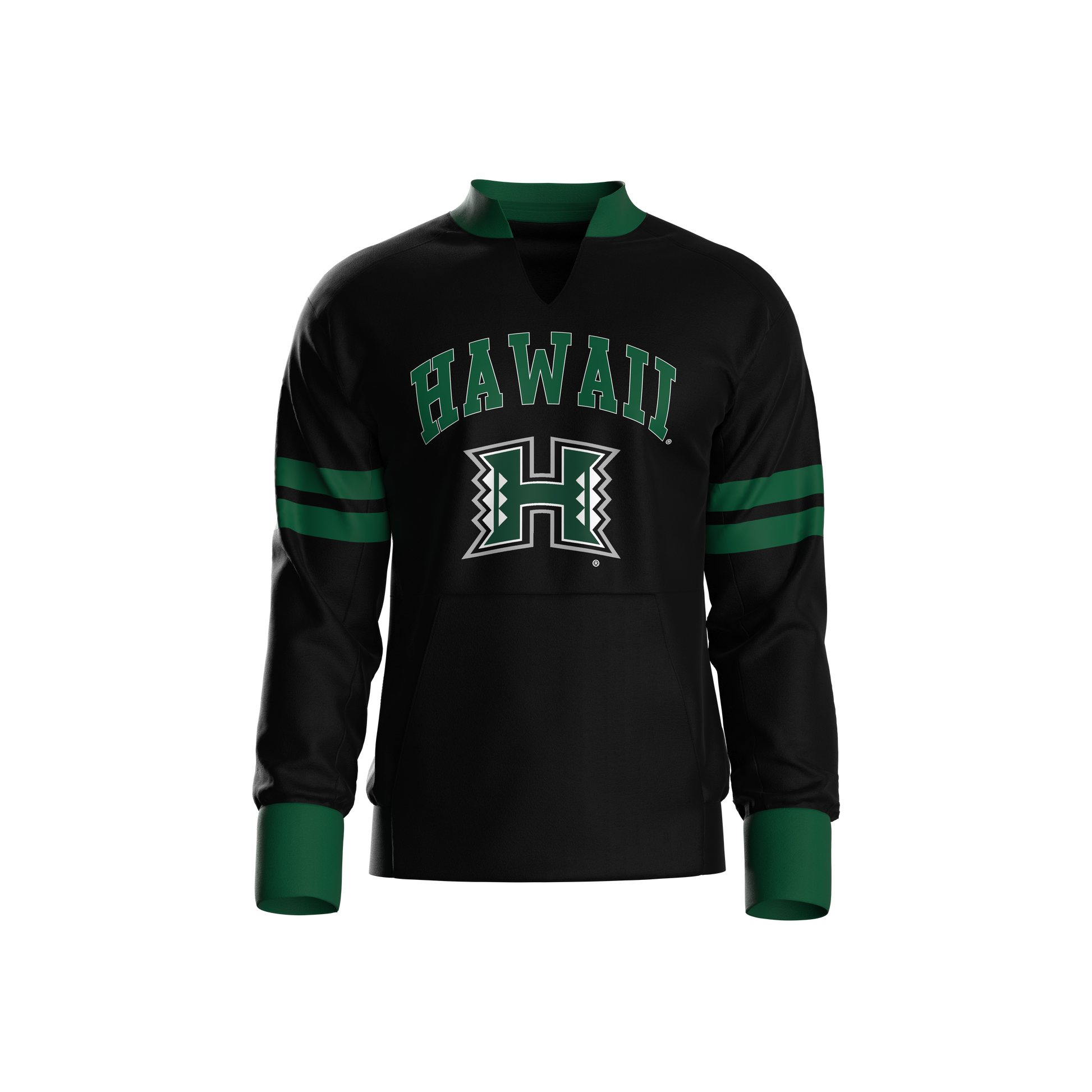 Get ready for the coin toss with this University of Hawaii Full Pullover Body. Keep your hands warm with a kangaroo pocket. Mix and match our various hood options with our hidden zipper in the collar of the body, keeping you warm while fully representing your team. The body boasts bold team graphics on the font, back and sleeve, which will have you looking like a Pro!